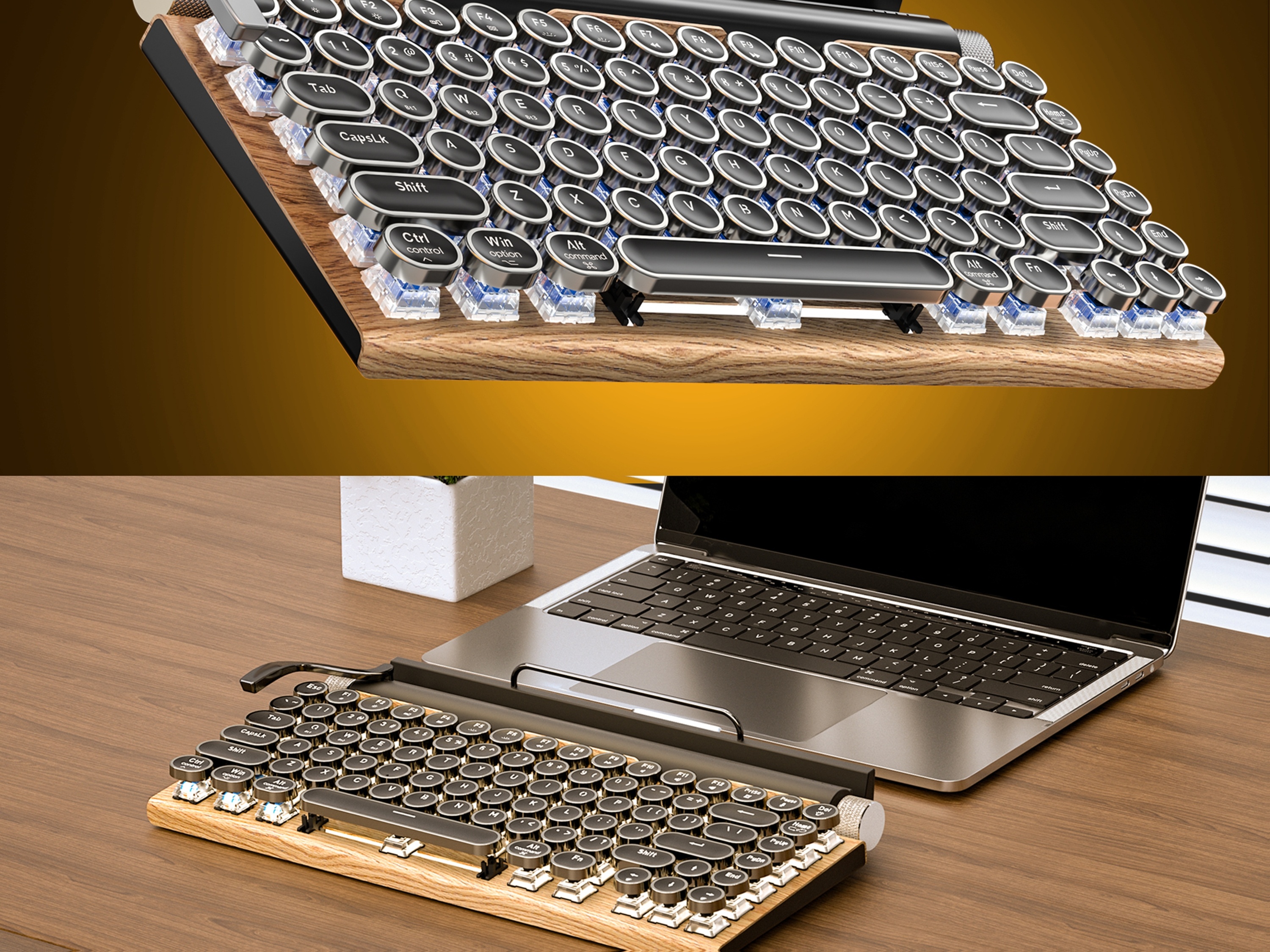 Retro Typewriter Wireless Mechanical Gaming Keyboard, Wireless Office Computer Vintage Keyboards 83-Key Blue Switches Punk Round Keycap, LED Backlight, Compatible With PC/Laptop/Pad/Phone