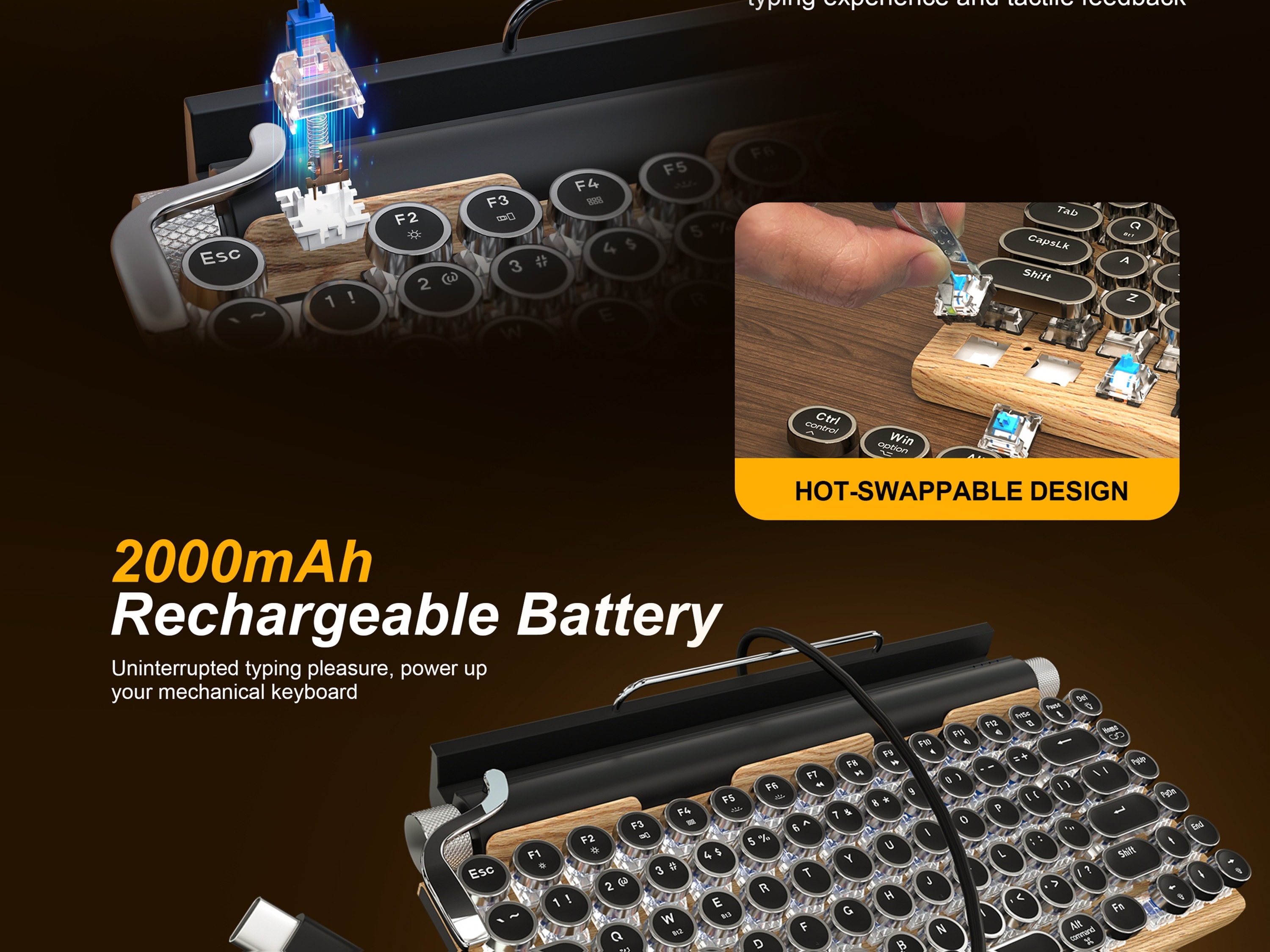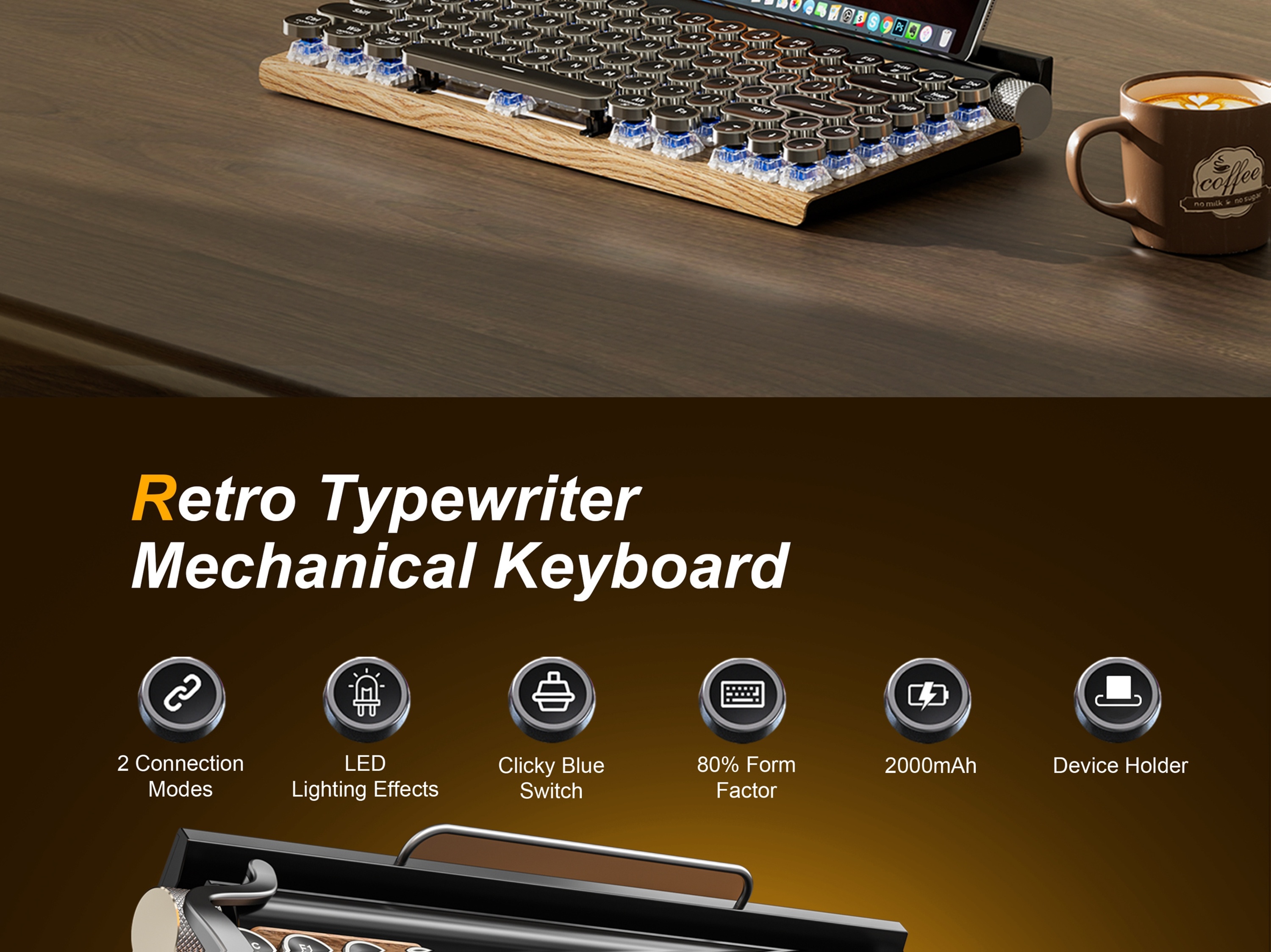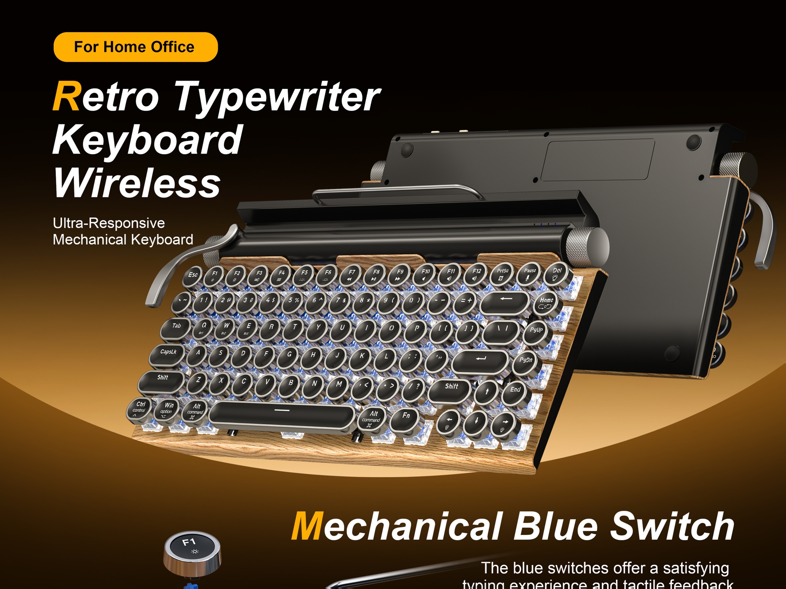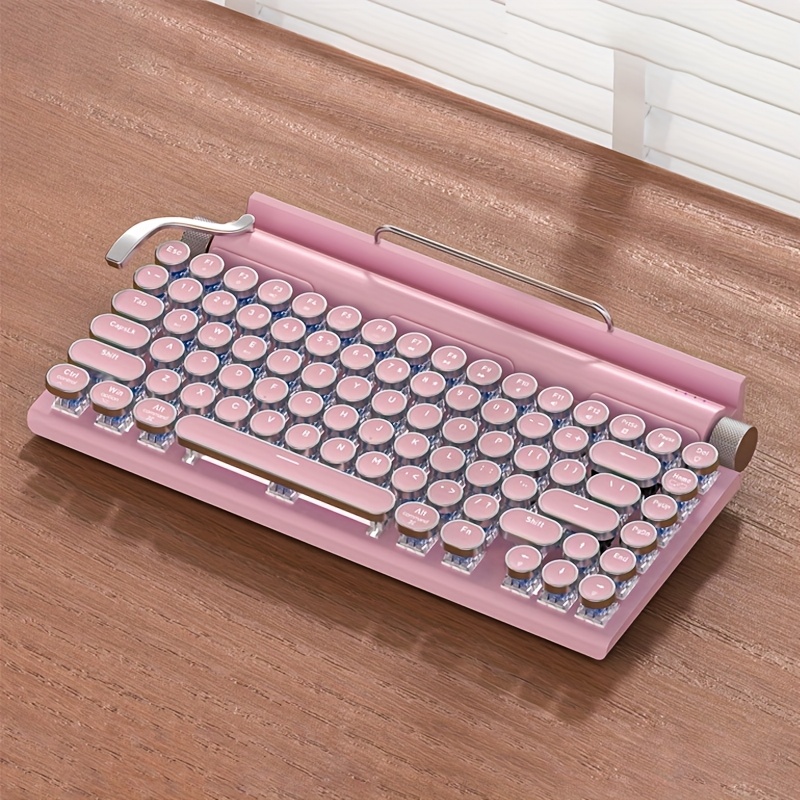 Retro Typewriter Wireless Mechanical Gaming Keyboard, Wireless Office Computer Vintage Keyboards 83-Key Blue Switches Punk Round Keycap, LED Backlight, Compatible With PC/Laptop/Pad/Phone