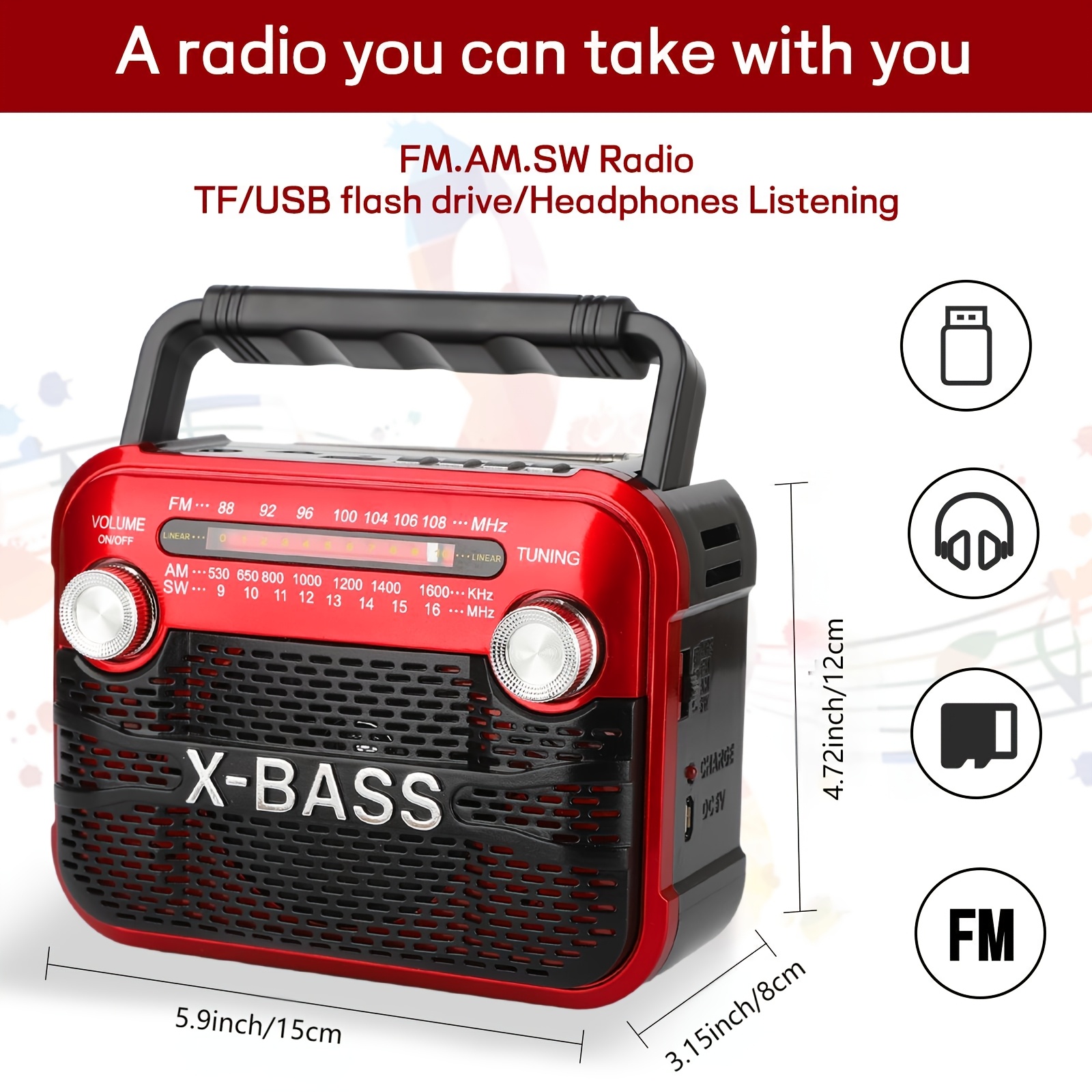 X-BASS Portable FM Radio with Flashlight - 800mAh Rechargeable Battery, Multi-Band (FM/AM/SW1-6), USB/TF/BT Playback, 2-4H Playtime, Red & Black, Ideal for Indoor & Outdoor Use, Radio Portable Rechargeable